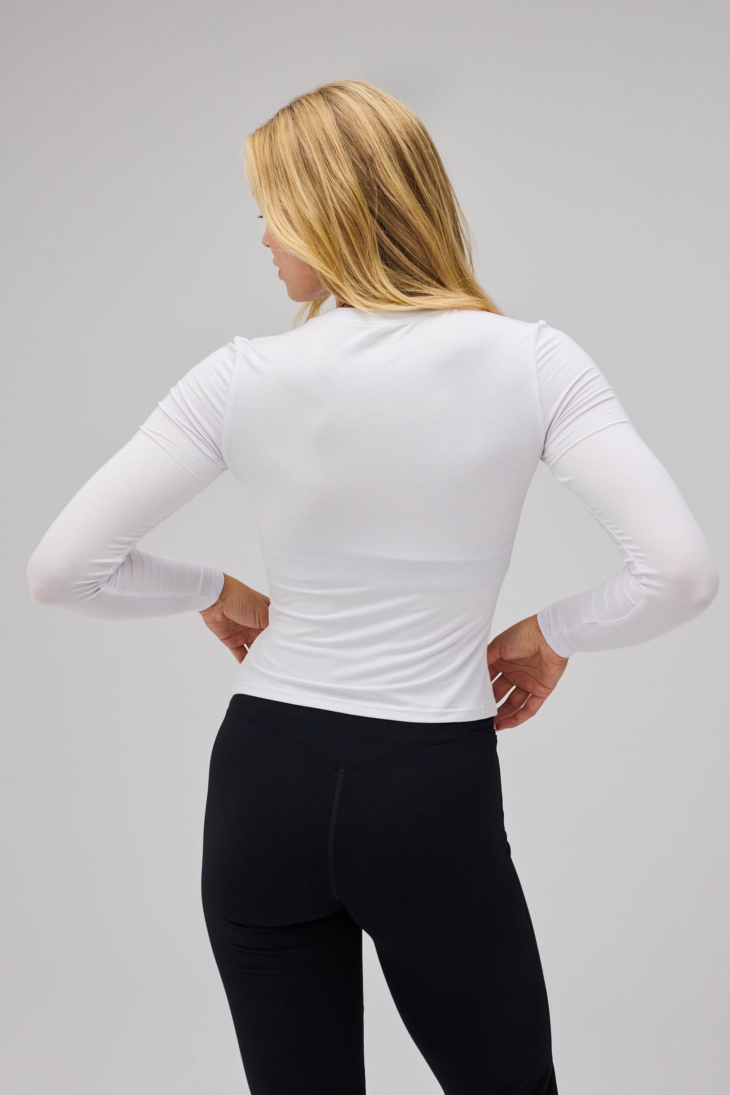 - Model wears Jersey T-shirt, Crystal White and wears size XS/S