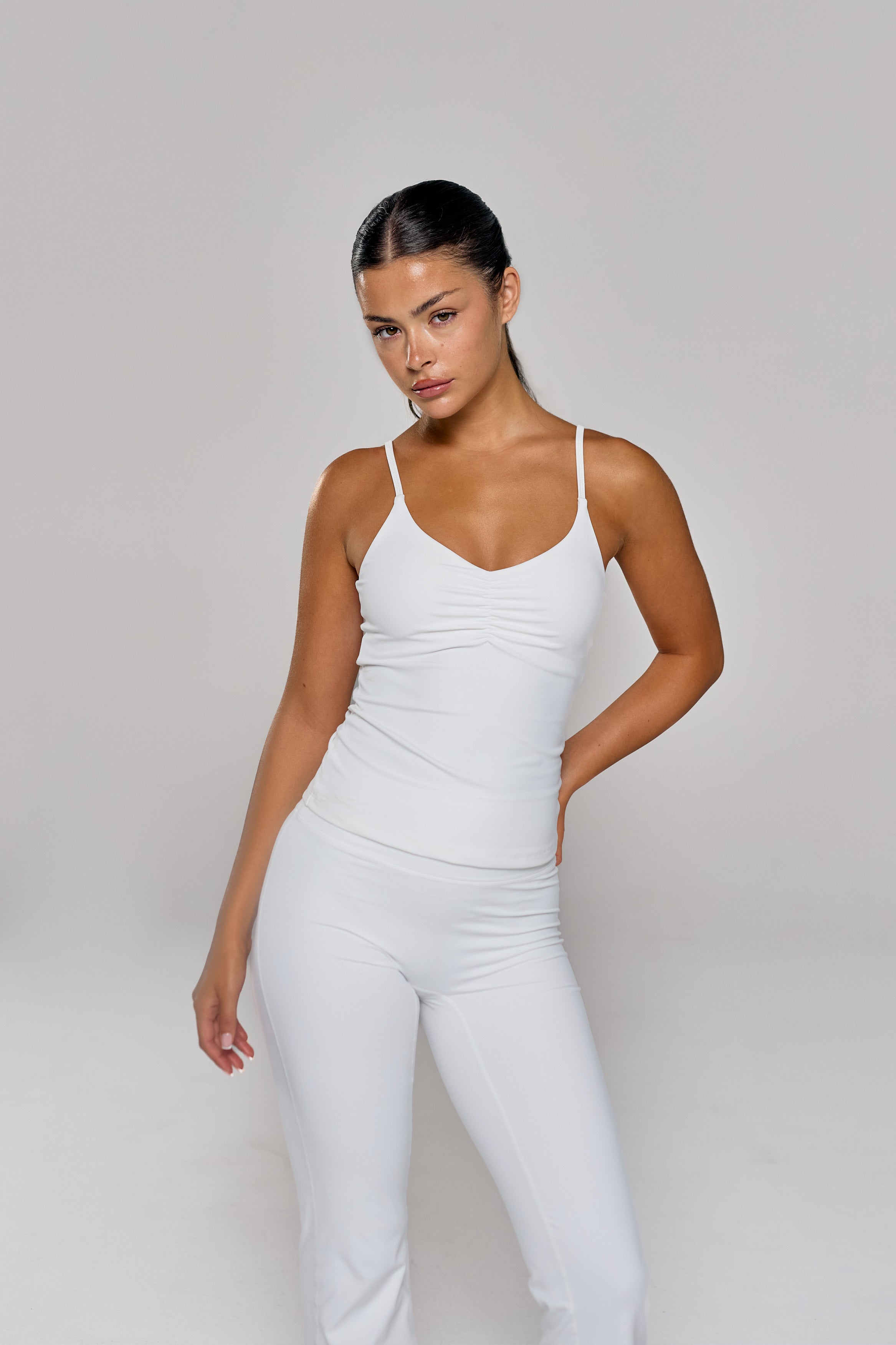 - Model wears Scrunch Tank Top, White and wears size XS