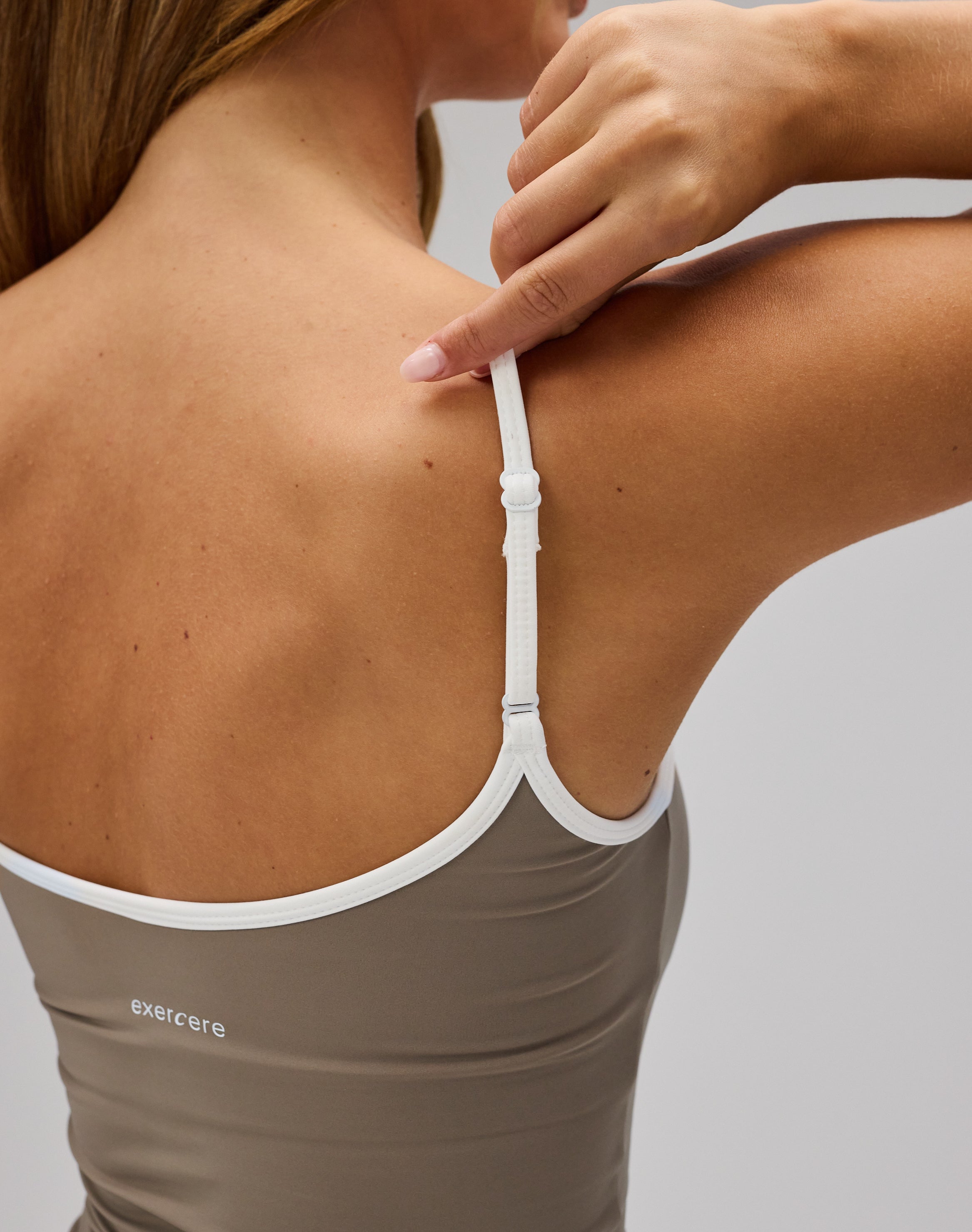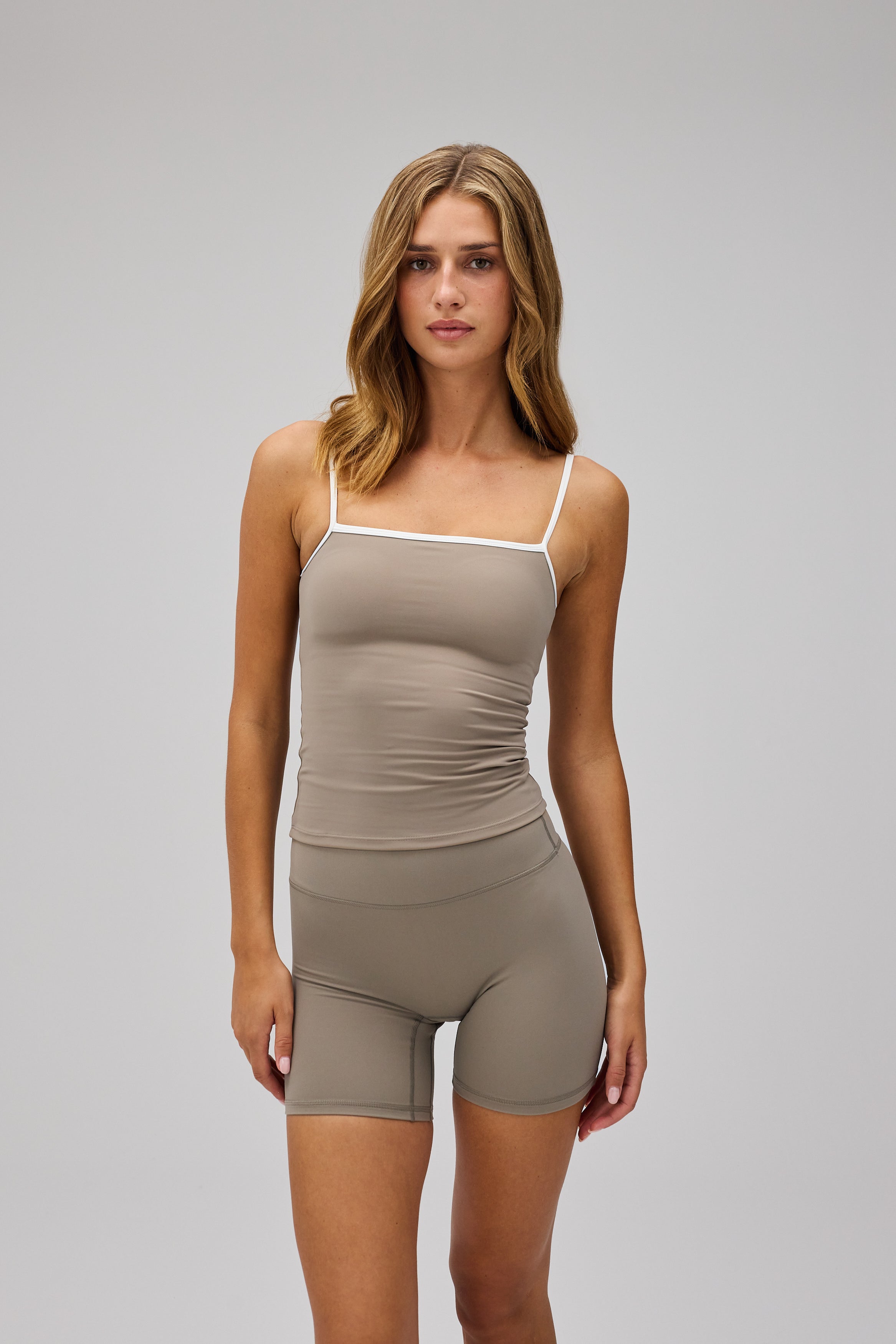 - Model has Active Tank Top, Sand Beige and wears size XS