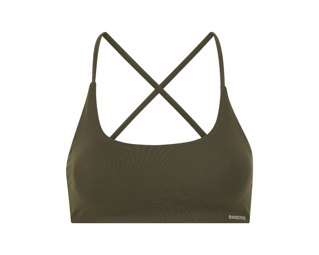The sports bra has removable inserts, thin straps and a feminine crossing on the back. It provides medium support during training.