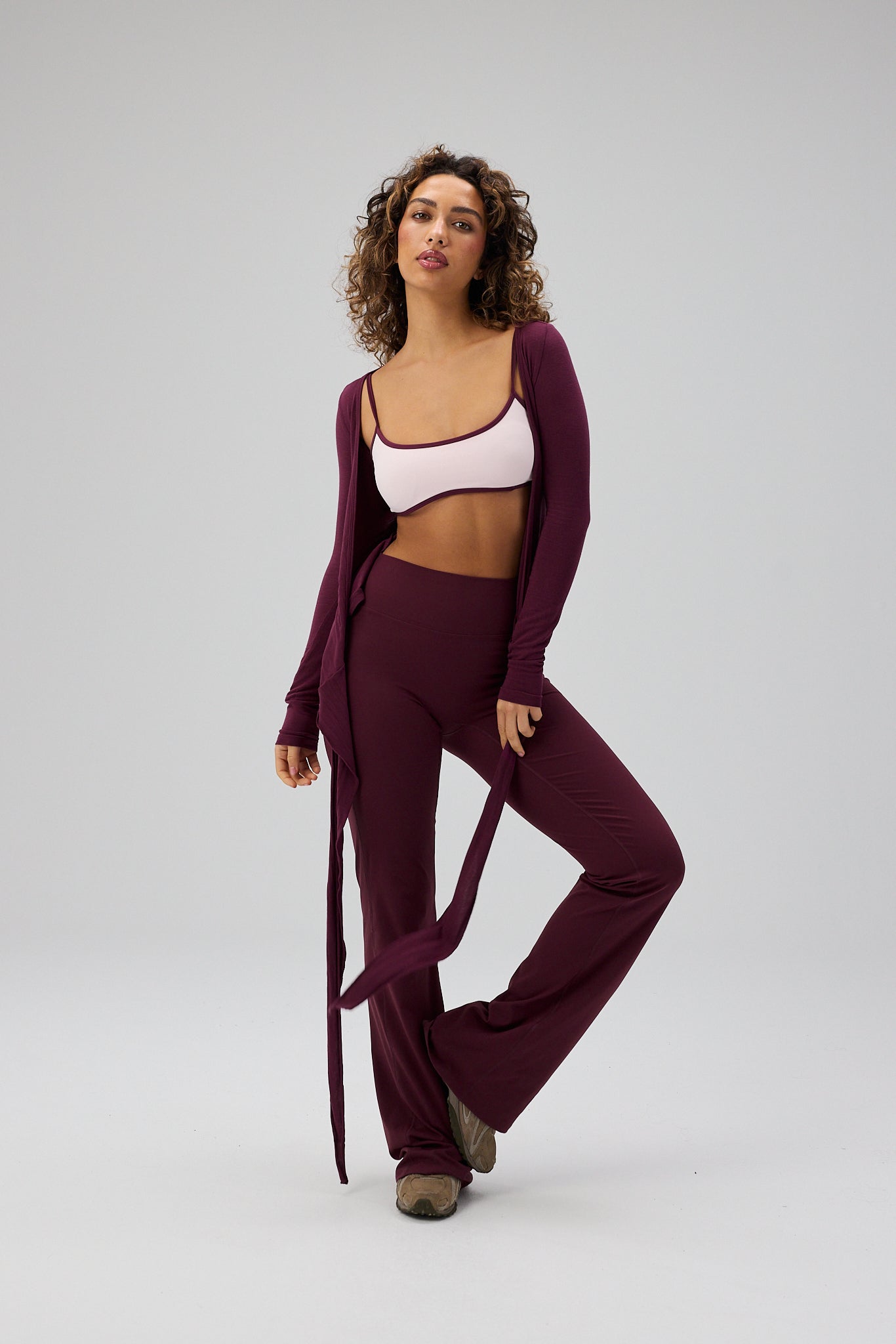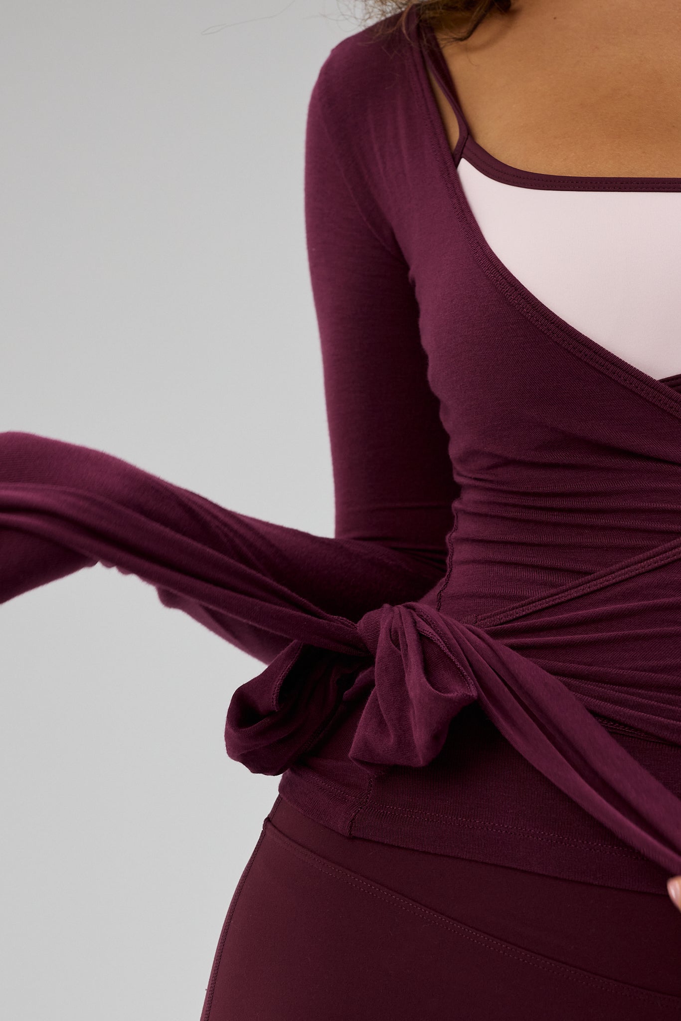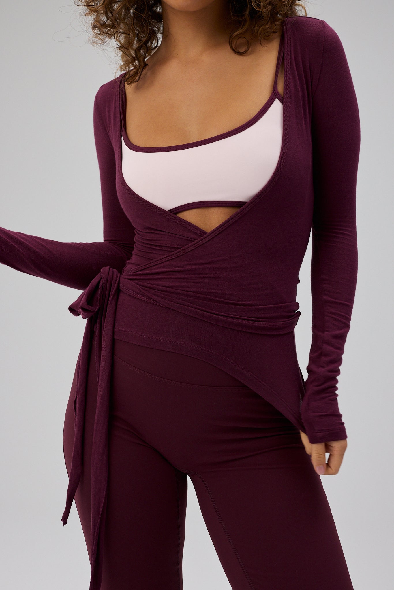 - Model is wearing Ballet Wrap Blouse, Deep Plum and wears size S/M