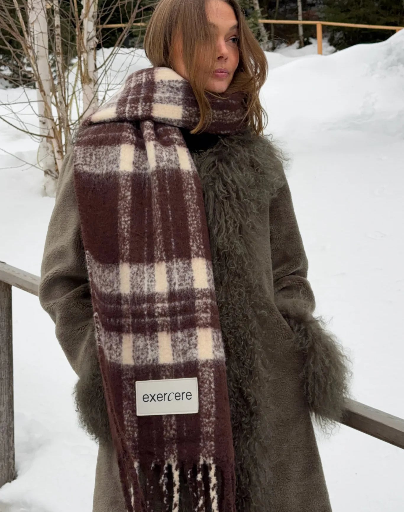 Limited Check Fringe Scarf kombinerer varme, komfort og et klassisk udtryk i et enkelt og gennemført design. Det ternede mønster i varme pecan-brune og off-white nuancer giver tørklædet et tidløst look, mens de fine fringe-detaljer tilfører bevægelse og karakter.