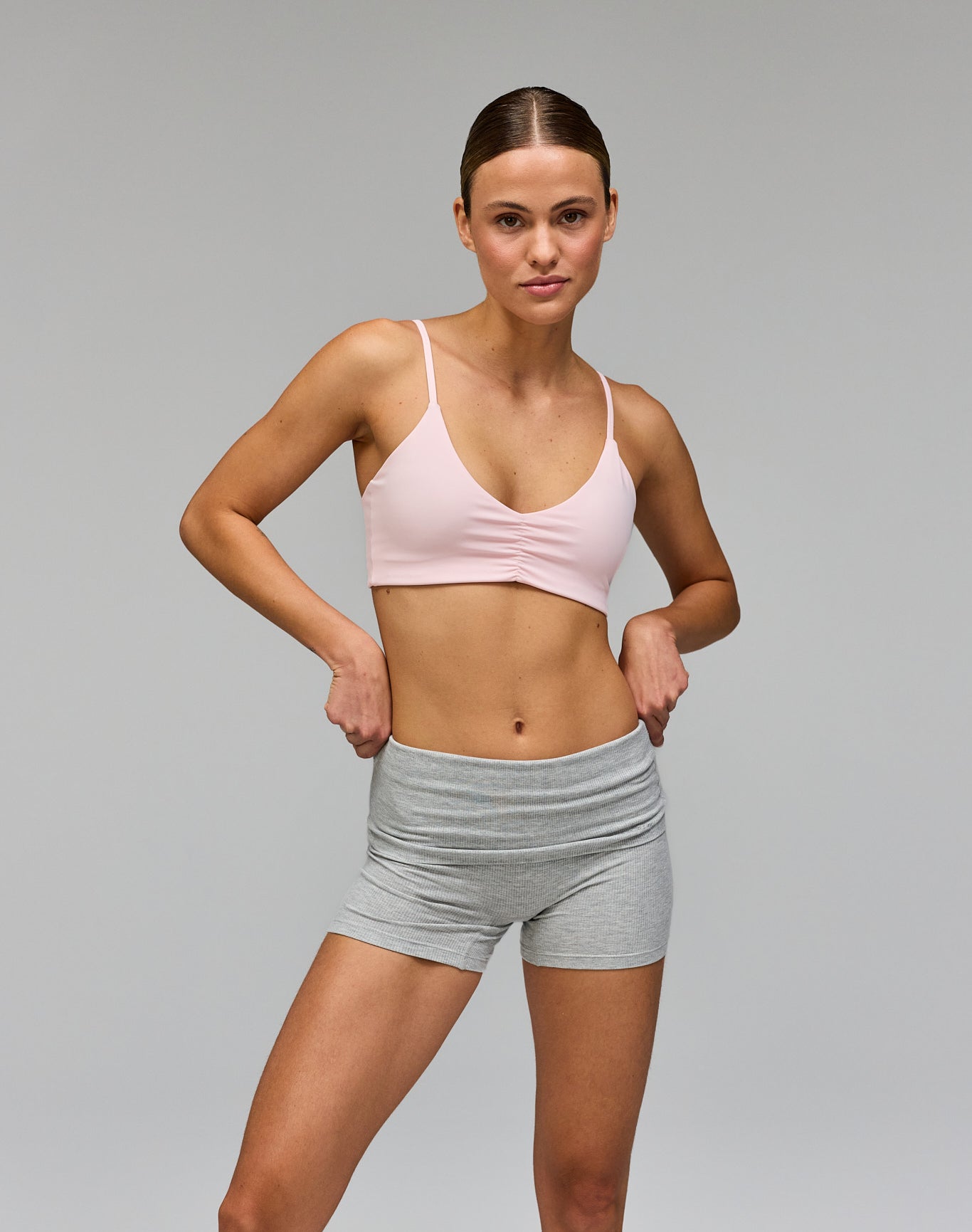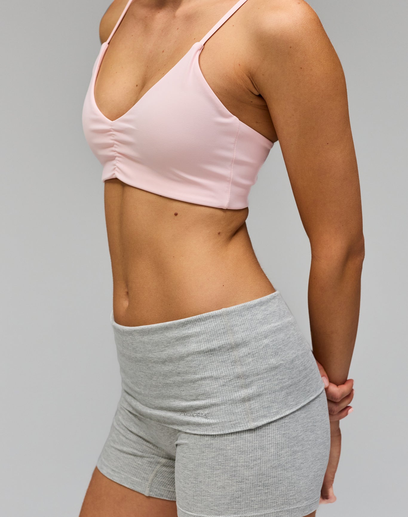 - Model is wearing Rib Fold Over Shorts, Gray Melange Version and wears size M at 175 cm.