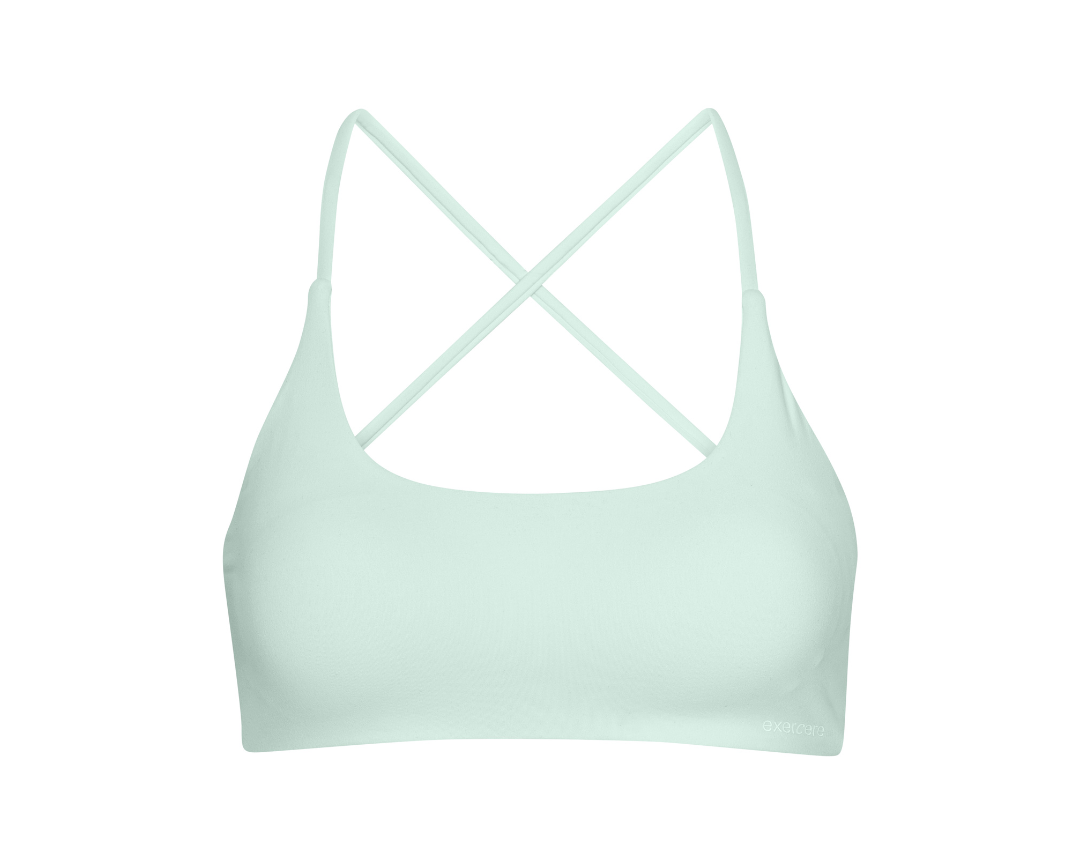 The sports bra has removable inserts, thin straps and a feminine crossing on the back. It provides medium support during training.