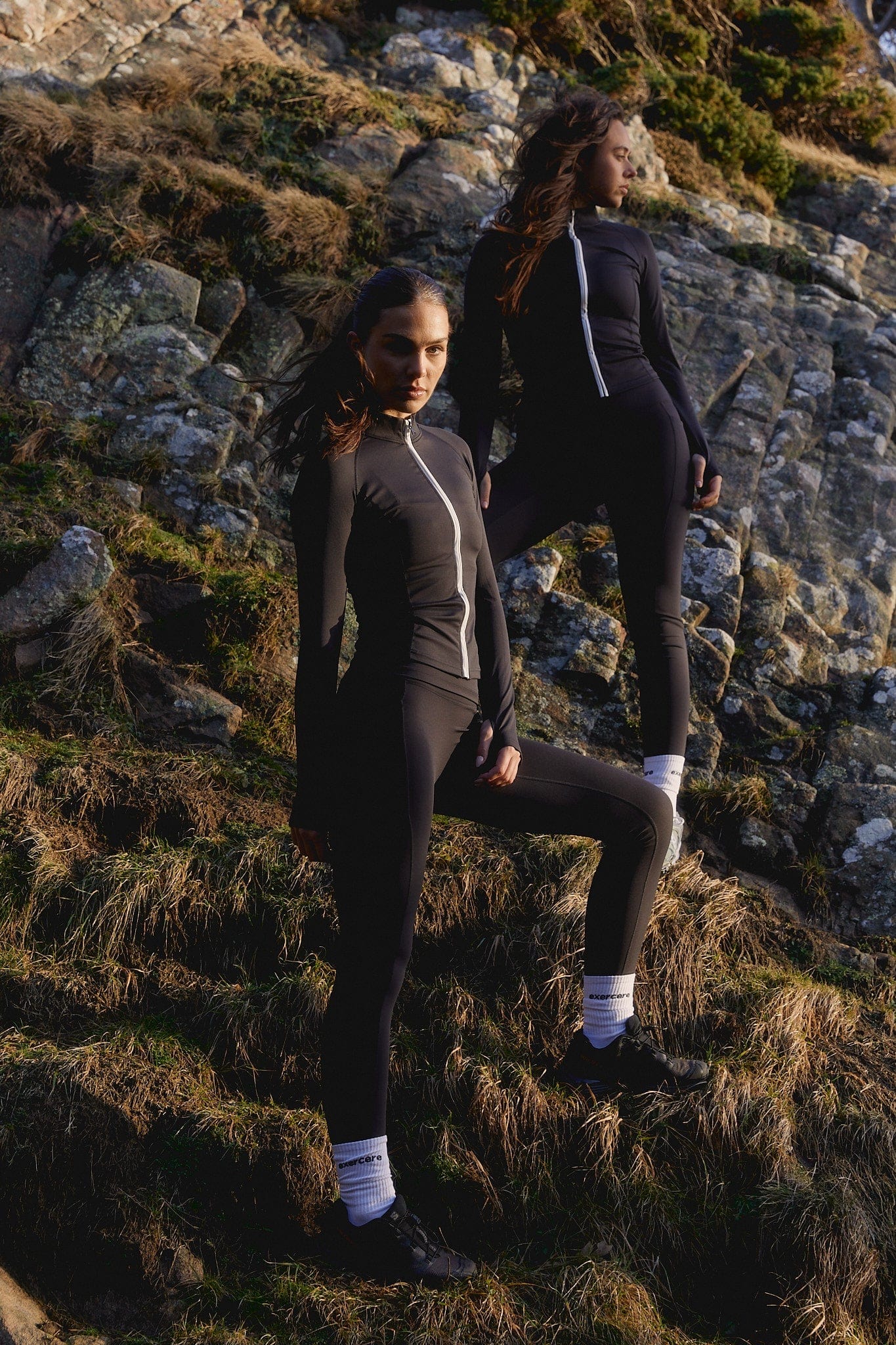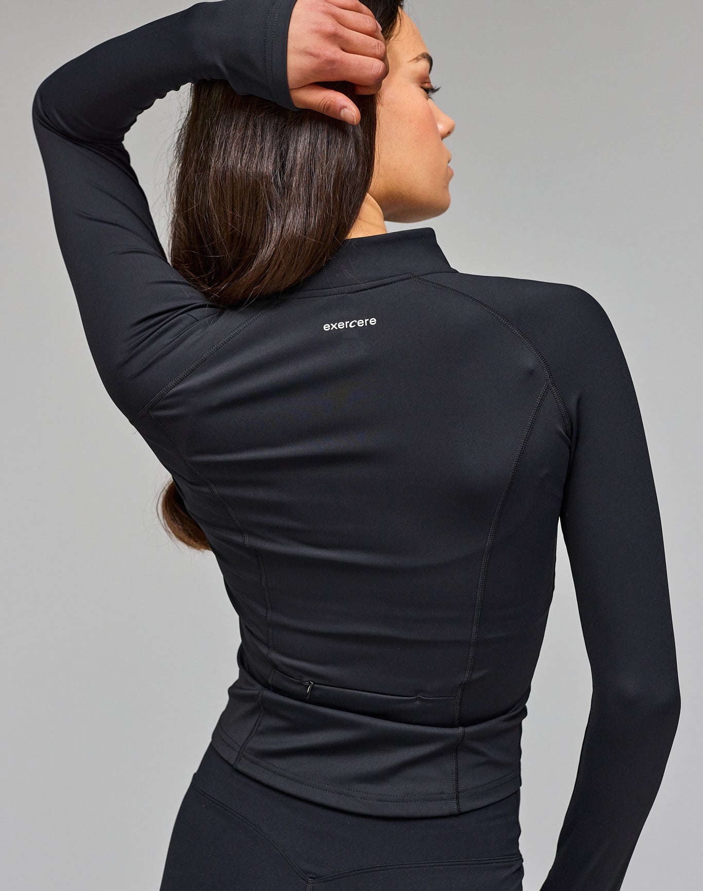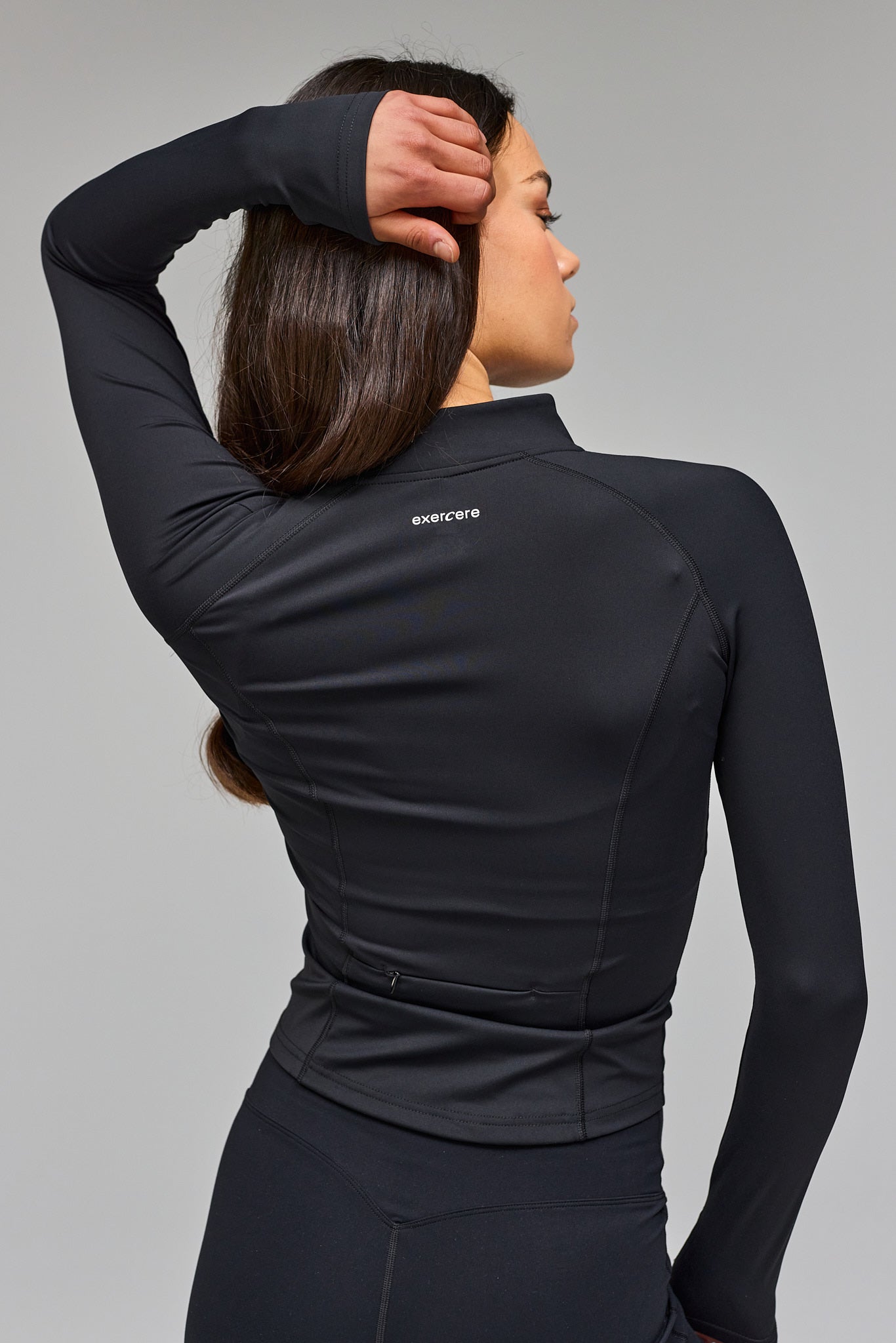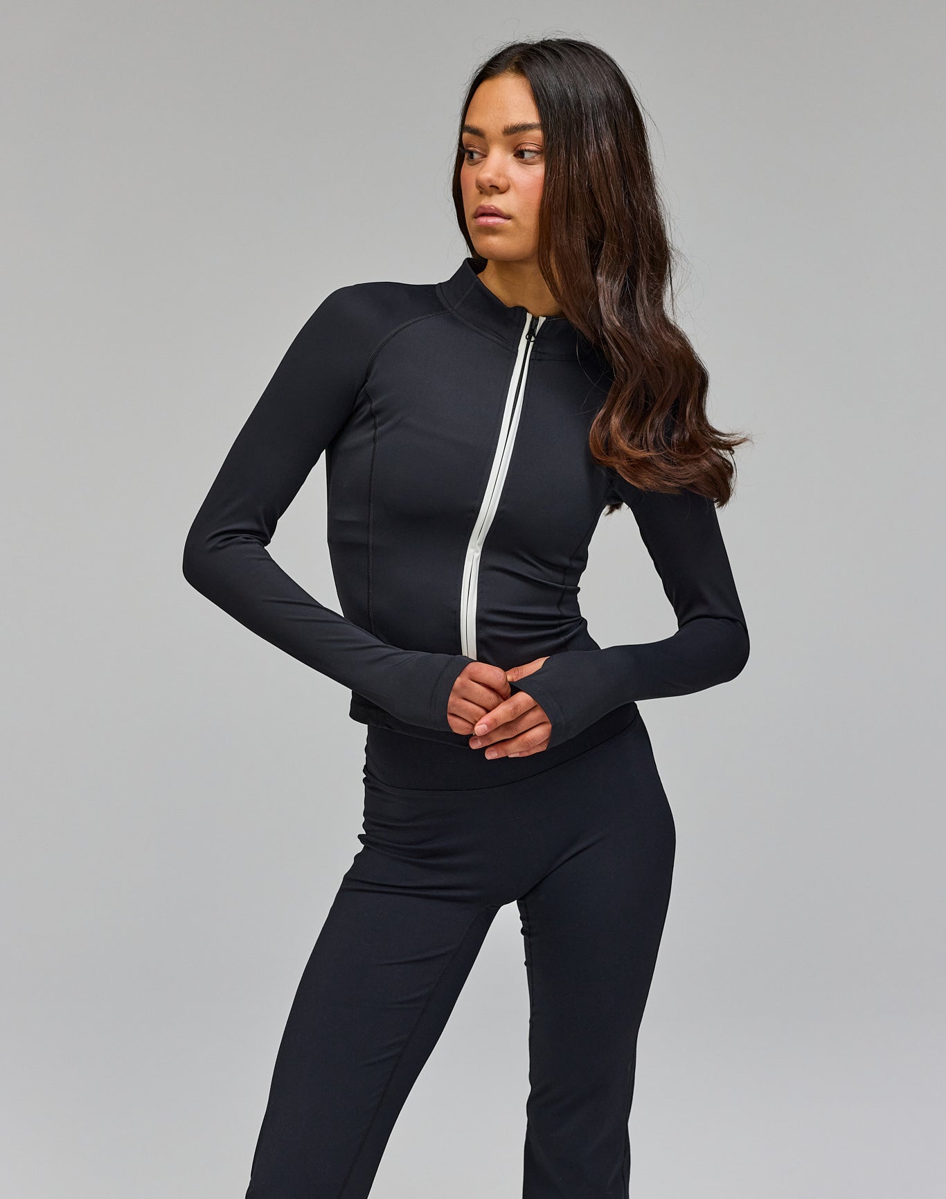 - Model is wearing Active Zip Blouse, Black and wears size XS/S